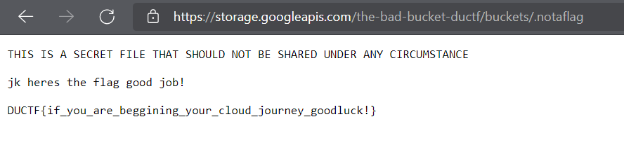 It’s so easy to find out the flag. Come back to the “https://storage.googleapis.com/the-bad-bucket-ductf/”, the site will be displayed the need informations