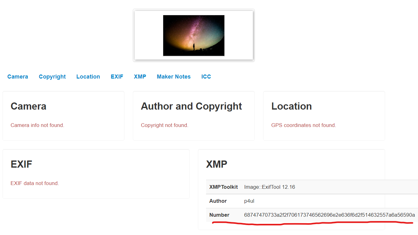 First, I think that the image will contain some data and I come up with “metadata”. So I use this tool to see what it be in.