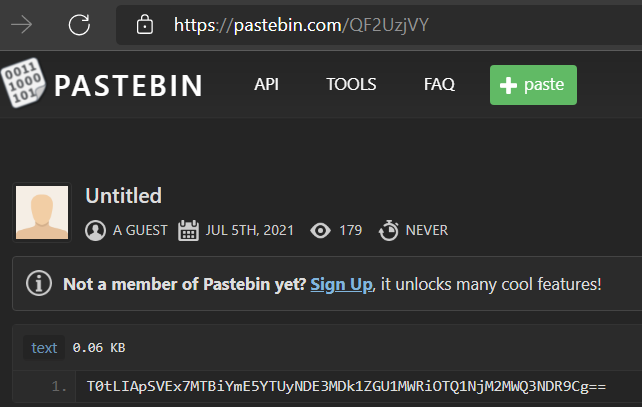 It is the hex numbers. Next, I decrypt it to ASCII with dcode.fr and have the link https://pastebin.com/QF2UzjVY. In there, we have a code same as base64. Finally, decrypt this code and get the flag.
